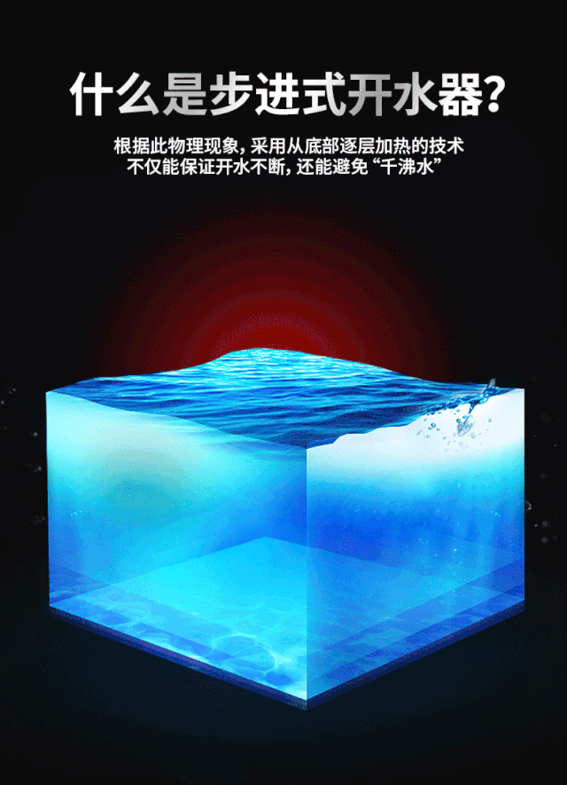 步进式饮水机所实现的是逐层进水,逐层加热,水被逐渐加热。步进式饮水机使得冷热水分离不会产生混合在一起的阴阳水的情况,保证了一次沸腾的健康的开水,是真正好用节能的校园直饮水开水器,电能控制确保了只有一次的沸腾,不让其重复加热烧开,例如箱体进了一升水之后,必须加热烧开,同时底部再次进一升的水,如此循环达到水箱满箱的情况。